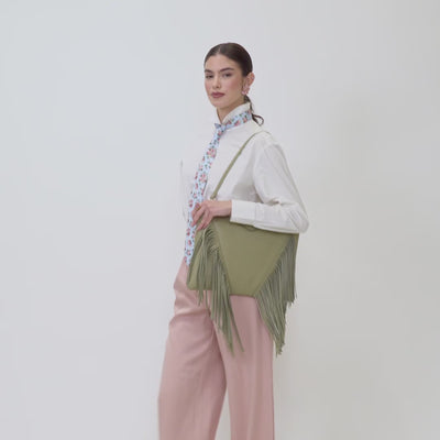 Tote bag in soft smooth calfskin, embellished with fringes. Ideal to carry both by hand and over the shoulder. Made entirely by hand.