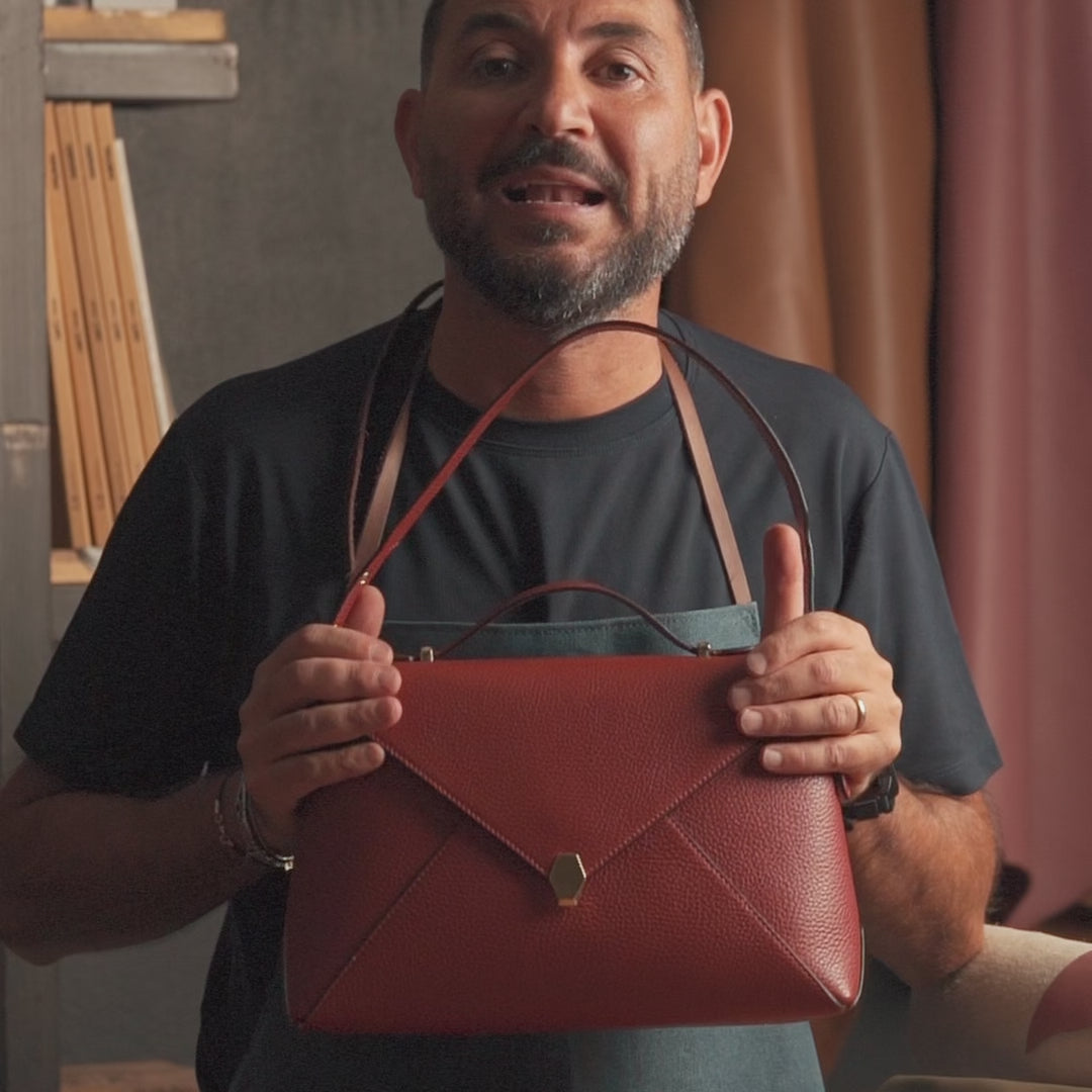 Postina in morbida pelle di vitello a grana dollaro, impreziosita da una chiusura magnetica in metallo. Pensata per adattarsi ad ogni momento della giornata: da portare a mano con il manico elegante e strutturato, comodamente a spalla grazie al manico regolabile con fibbie, oppure a bandoliera con la tracolla in pelle. Realizzata interamente a mano.