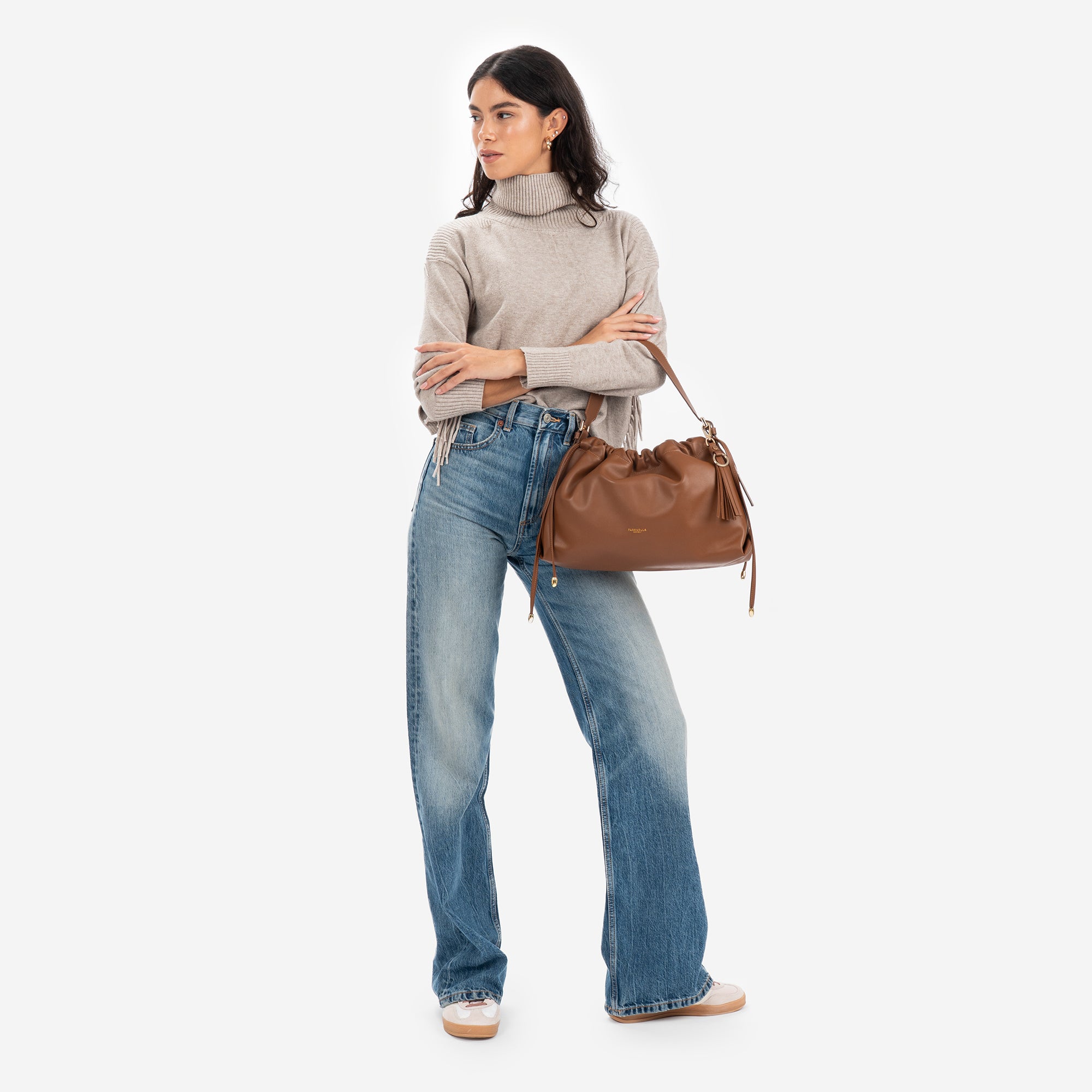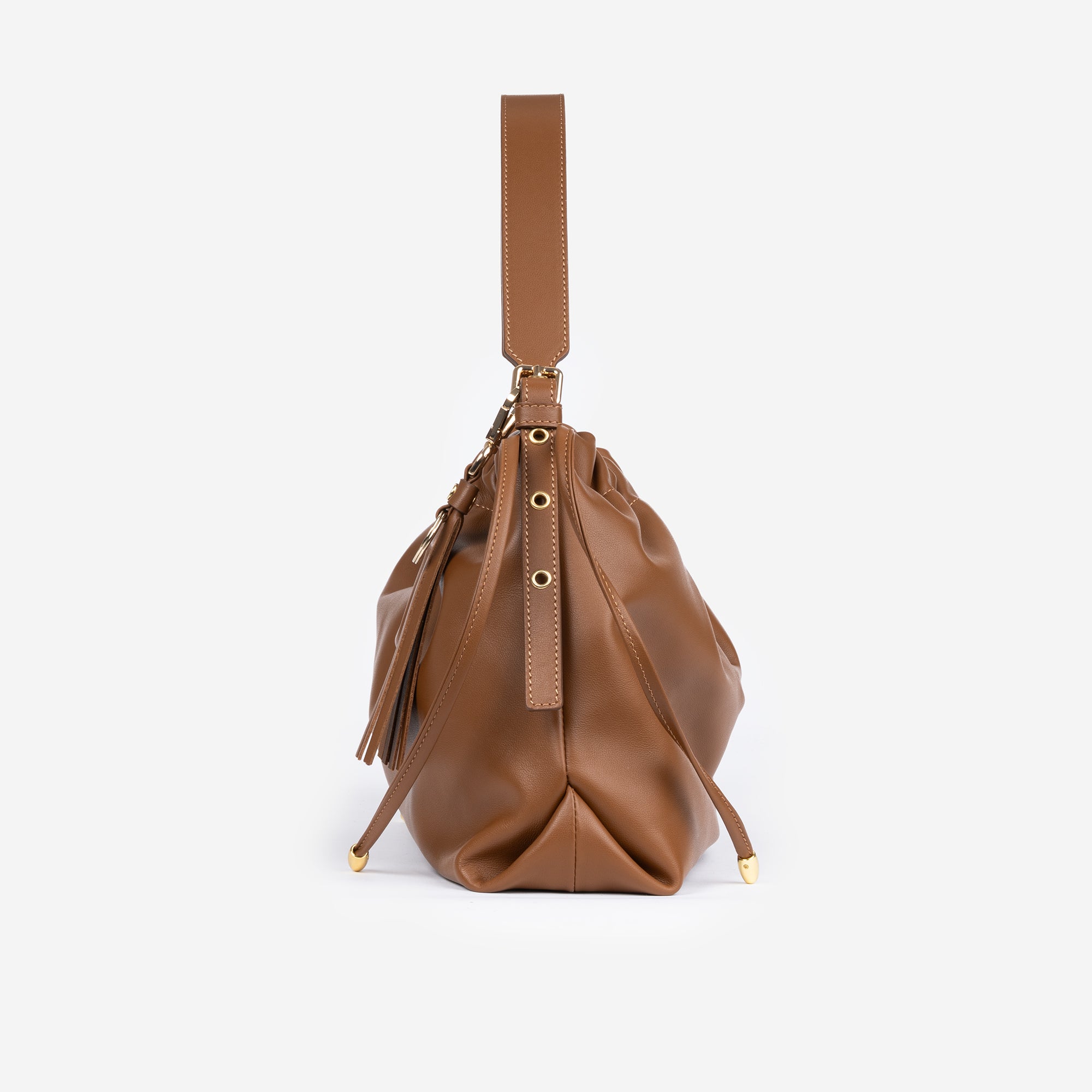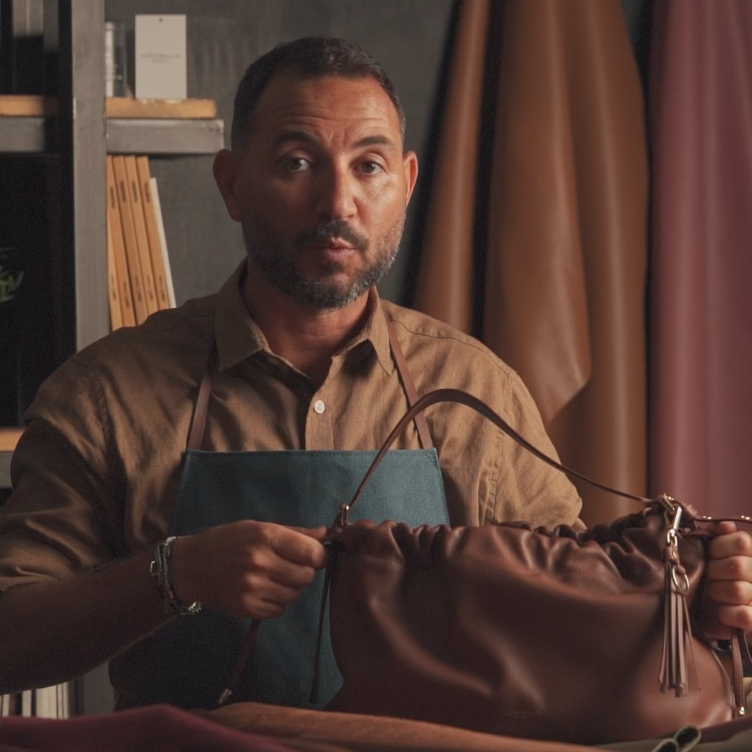 Sacca arricciata in pelle di vitello liscio pieno fiore realizzata interamente a mano. La superficie del pellame è caratterizzata da una finitura uniforme che emana una luminosità naturale. Al tatto offre una sensazione di grande morbidezza.