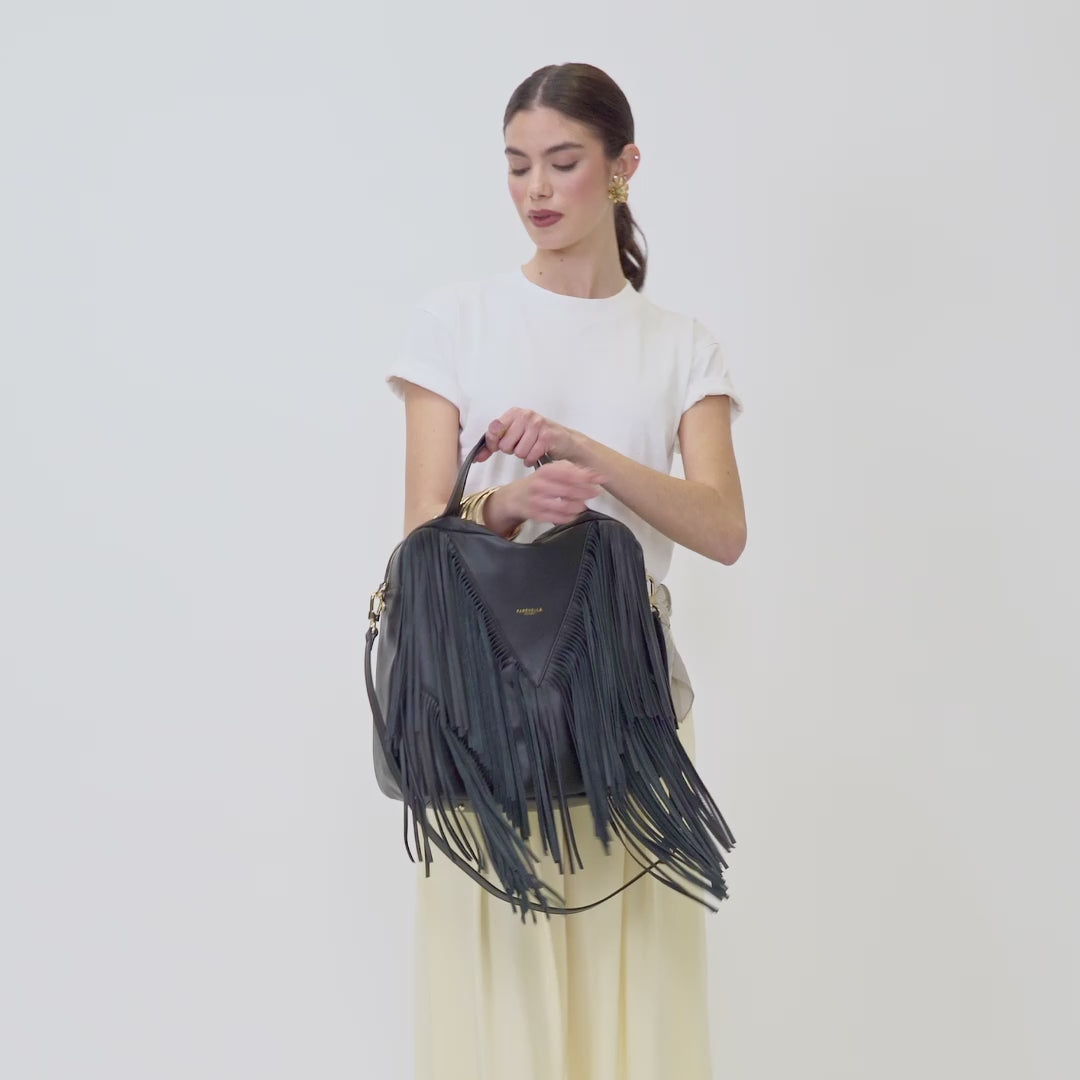 Una borsa capiente e distintiva, dove la morbidezza del vitello pieno fiore incontra il movimento e l’energia delle frange.