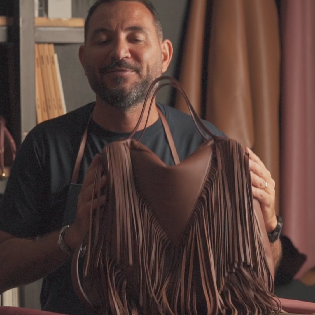 Una borsa capiente e distintiva, dove la morbidezza del vitello pieno fiore incontra l’energia delle frange.
