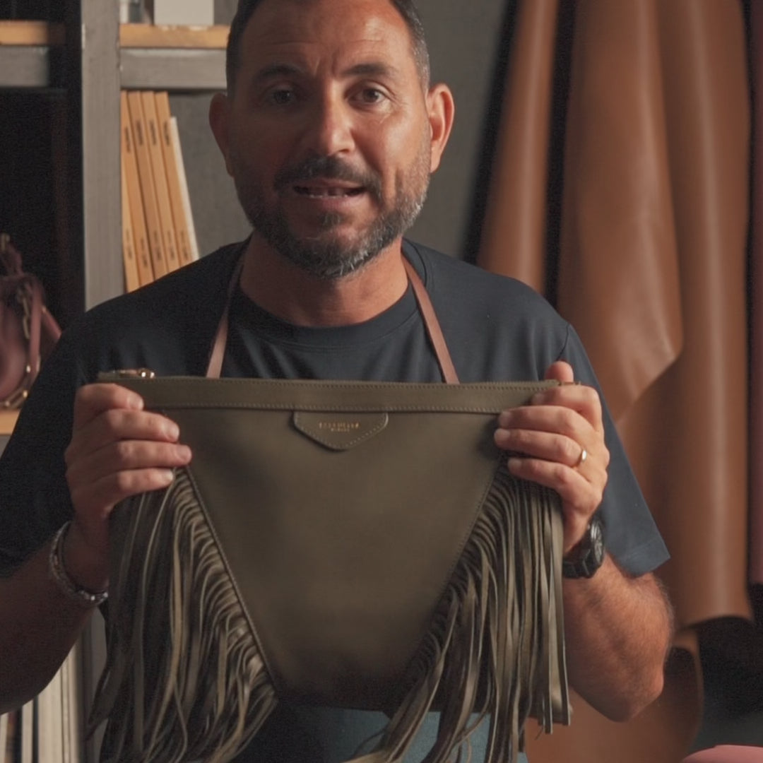 Una borsa che unisce essenzialità e carattere, dove le linee pulite del vitello pieno fiore incontrano l’energia dinamica delle frange.