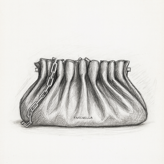 Sulla chiusura clutch con spillone la pelle si raccoglie in un drappeggio fluido, formando onde regolari che donano movimento e carattere al design. La cerniera clutch in metallo, elegante e sicura, diventa un dettaglio distintivo che valorizza la borsa.