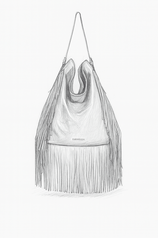 Lungo i profili laterali scendono le iconiche frange Farenella, un tratto distintivo che dona movimento e carattere al design. Pensata come borsa da giorno, unisce capienza e praticità: può essere indossata comodamente a spalla grazie al manico regolabile con fibbie, oppure a tracolla con la tracolla in pelle.