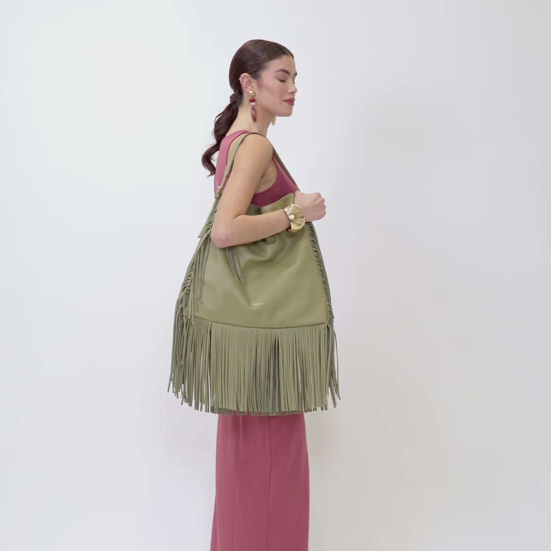 La Partenope è fantastica! Le frange le danno un tocco unico e non passa mai inosservata. È molto capiente, quindi la porto spesso con me per tutto il giorno. Mi piace come riesce a rendere speciale anche l'outfit più semplice. Una borsa che adoro!